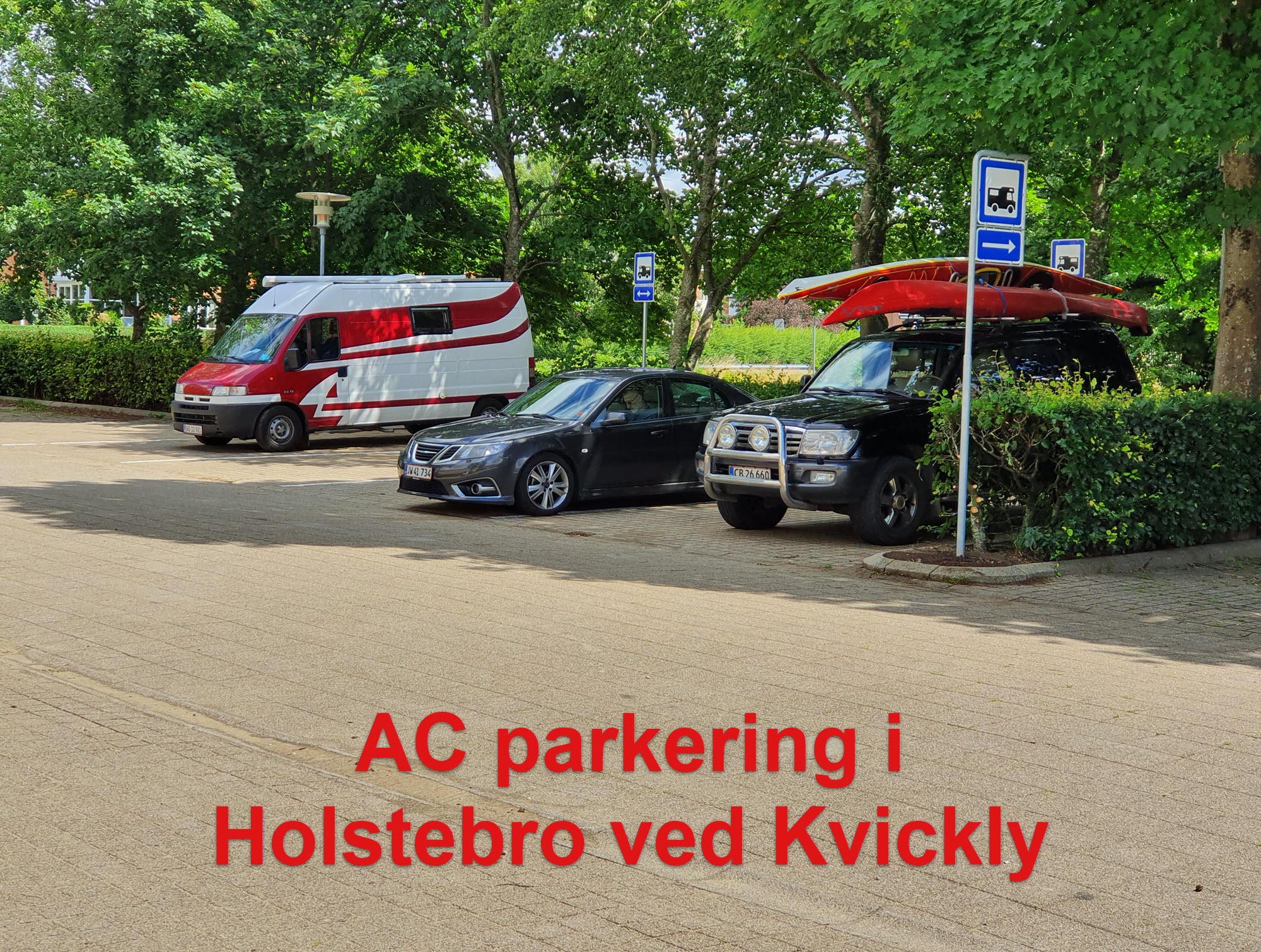 Vi kom igennem Holstebro i fredags og så, at kommunen var blevet færdige med at anlægge de lovede 4 pladser efter flere års arbejde af Jytte og DFAC. Det er 4 pladser noget længere og bredere end resten af pladserne, i skygge af høje træer. Der er ingen begrænsning af ophold eller vægt. Ingen toilet mm.